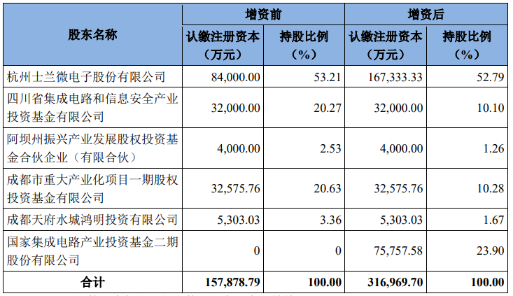公告显示,在本次增资中,士兰微出资11亿元,大基金二期出资10亿元,本次新增注册资本 159,090.91 万元。增资完成后,成都士兰的注册资本将由 157,878.79 万元增加为316,969.70 万元,士兰微仍是其控股股东。本次增资前后,成都士兰的股权结构如下: