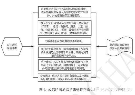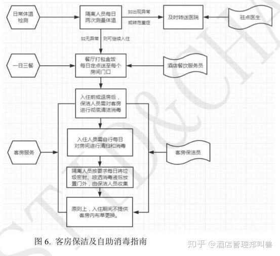 5、入住前或退房后,需对客房进行全面清洁和消毒。做到先清洁,再消毒。除正常酒店房间清沽外,还需进行额外消毒作,包括:对家具、家电设施用消毒液进行擦拭消毒;卫生间整体环境、马桶圏及家具表面和提供的部分物品(如吹风机和体重秤等)使用消毒液进行消毒:推荐使用紫外线至少照30分钟(如有):酒店布草严格做到一客一换一消毒,必要时可采买密封客耗品。对于有疑似患者和确诊患者入住的房间,房间内及布草用品应参照疾控部门要求及传染类医疗布草的终末处理要求,由专人进行处置。