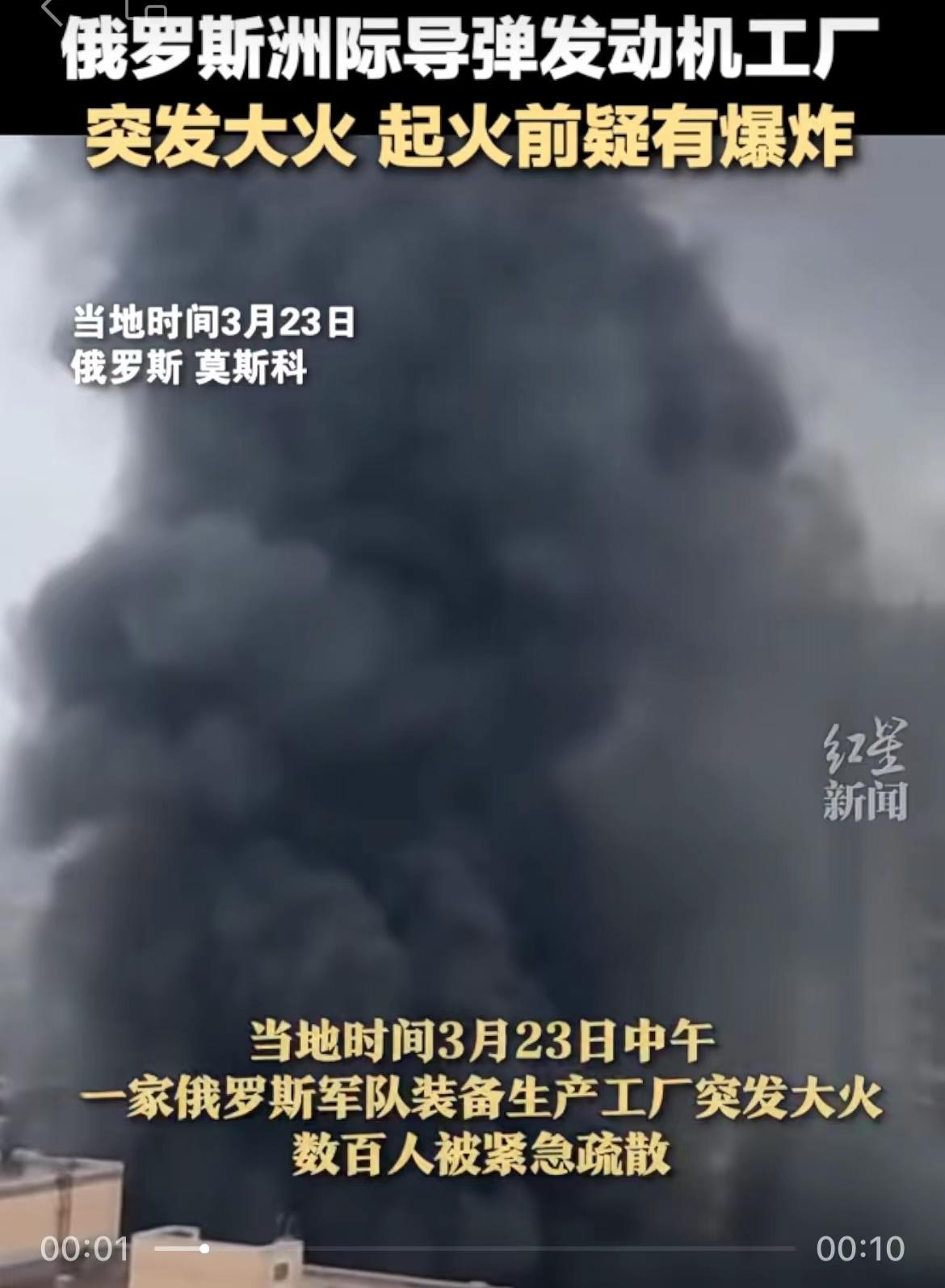 3月23日中午,在距离莫斯科东北270公里处,一家俄罗斯军工厂突发大火,远处能看到黑烟滚滚。